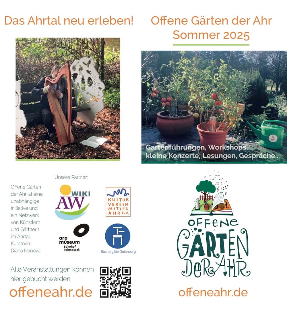 Wir bedanken uns von Herzen an alle Gärtnerinnen, Gärtner und Künstler für die wunderbaren Veranstaltungen! Danke an alle Teilnehmenden für das Vertrauen und das gemeinsame Erleben des neuen Ahrtals!