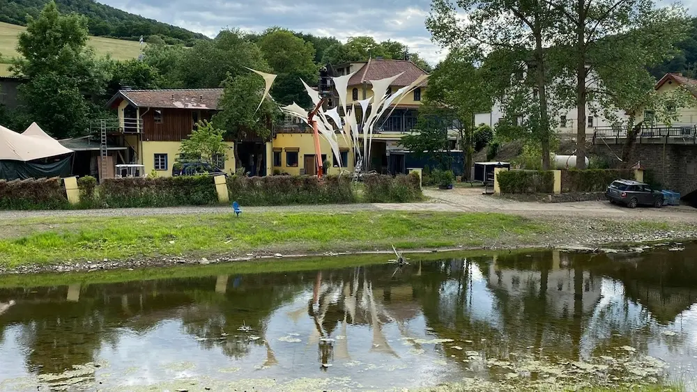 Das Ehepaar Karen Balzer und Hermann Schug ist Gründer der Theatergruppe „Feuervogel“, die seit Jahren weltweit arbeitet – mit Stelzentheater, Akrobatik, Mythologie… Jetzt öffnen sie zum ersten Mal nach der Flut ihren Garten.